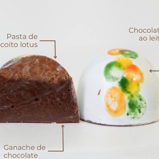 Casquinha de chocolate ao leite, recheado com ganache de chocolate ao leite e pasta de biscoito Lotus.