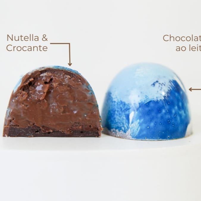 Casquinha de chocolate ao leite, recheado com Nutella crocante. *Todos os nossos bombons são artesanais, pintados à mão e feitos para consumo imediato.