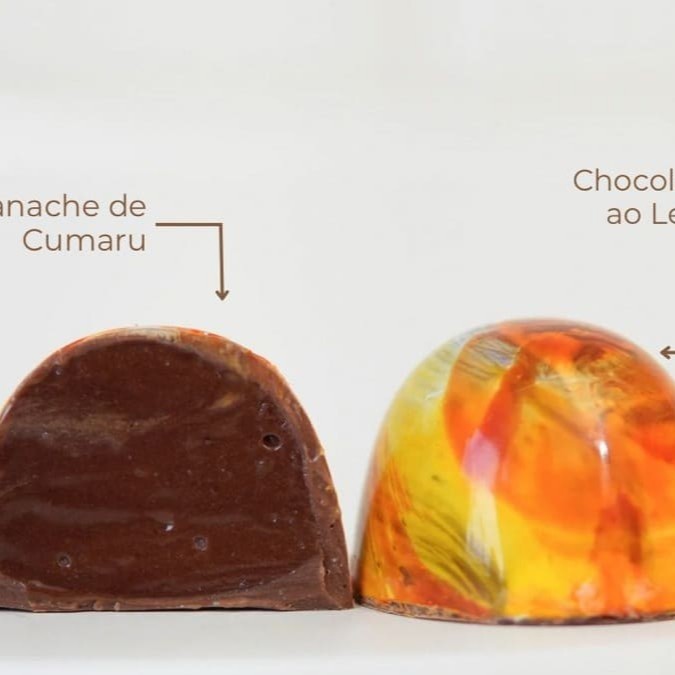 Casquinha de chocolate ao leite, recheado com ganache de cumaru (também conhecido como: baunilha brasileira ou fava tonka). *Todos os nossos bombons são artesanais, pintados à mão e feitos para consumo imediato.