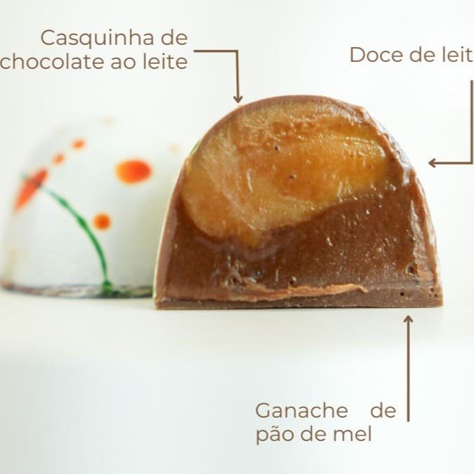 Casquinha de chocolate ao leite, recheado com doce de leite e ganache de pão de mel. *Todos os nossos bombons são artesanais, pintados à mão e feitos para consumo imediato.