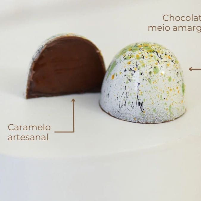 Casquinha de chocolate ao leite recheado com caramelo artesanal. *Todos os nossos bombons são artesanais, pintados à mão e feitos para consumo imediato.