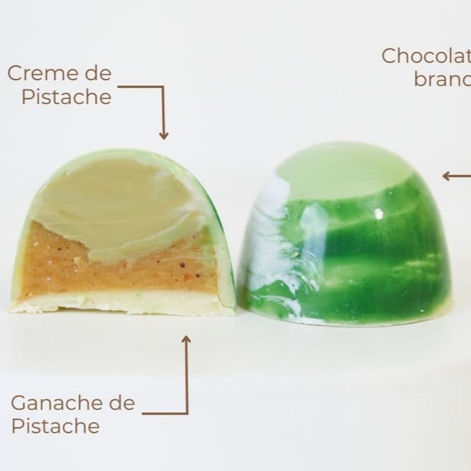 Casquinha de chocolate branco, recheado com creme de pistache e uma camada de ganache de pistache.