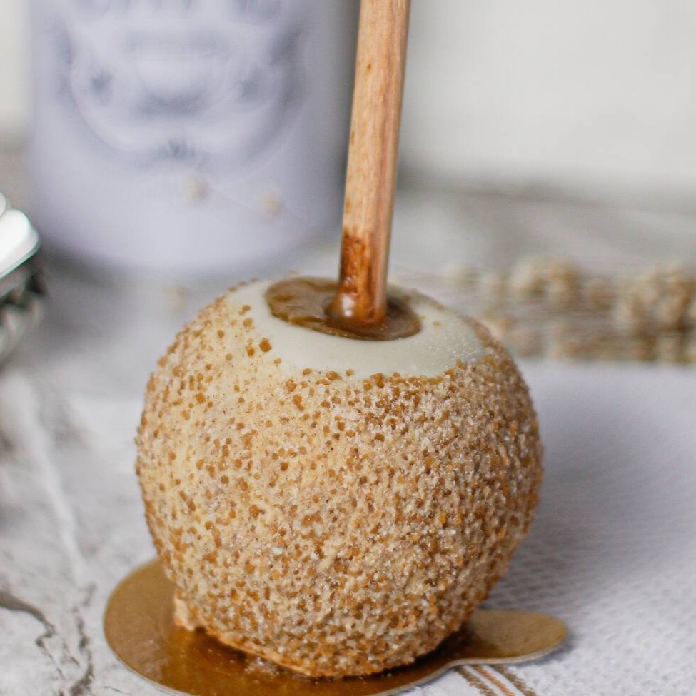 A maçã mais elogiada do programa Que Seja Doce no Gnt! Maçã verde coberta com nosso caramelo artesanal de cumaru, chocolate branco e uma farofinha especial de açúcar, com um toque de canela e especiarias.