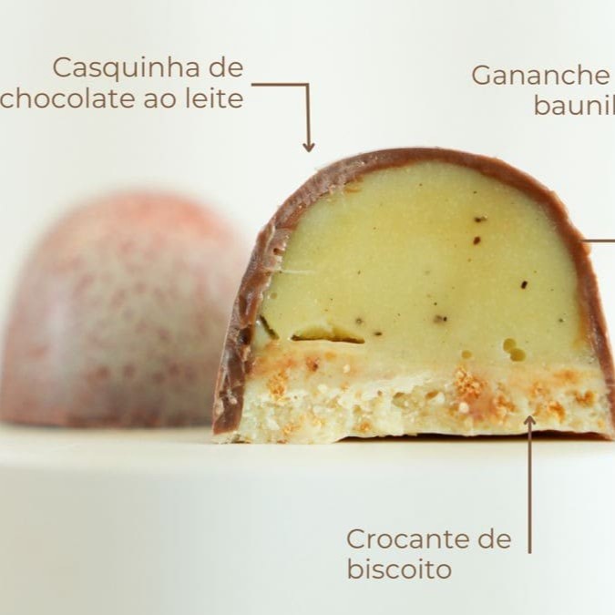 Casquinha de chocolate ao leite, recheado com uma camada de ganache de baunilha e uma camada de crocante de biscoito.