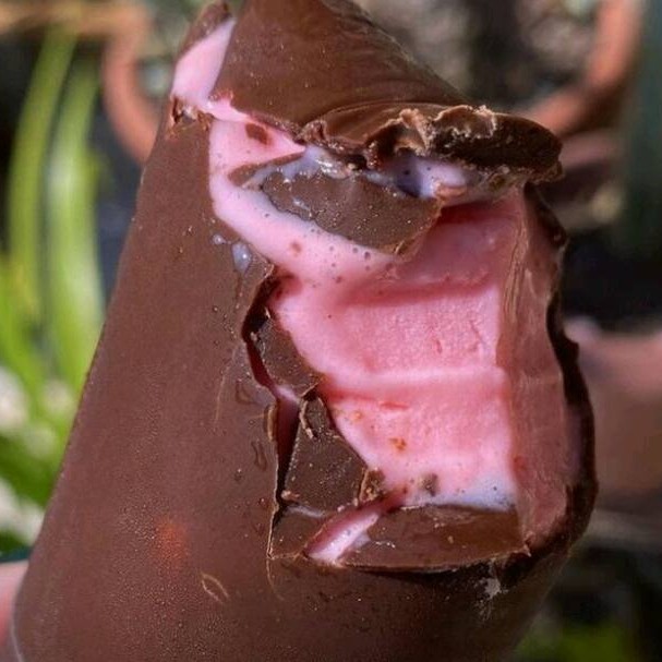 Feito com casquinha de chocolate meio amargo e um creme preparado com leite condensado, creme de leite e morangos frescos, resultando em um geladinho super cremoso e delicioso.