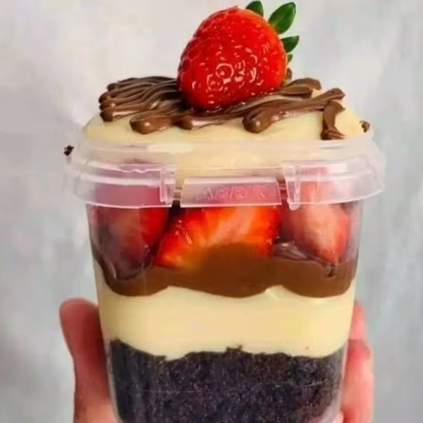 Camadas generosas de brigadeiro de leite Ninho, creme quatro leites super cremoso e morangos fresquinhos.