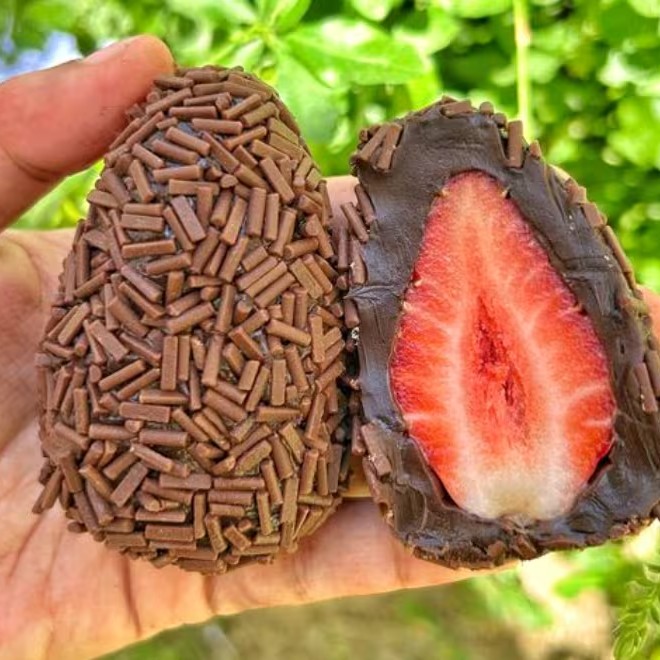 Brigadeiro gourmet de Chocolate , com textura suave e cremosa envolvendo morango e castanha de caju . Um toque generoso de Nutella na finalização.