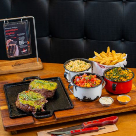 Brazilian Picanha: 500 g de picanha com rub defumado, acompanhada de 4 delícias e 2 molhos à escolha. O prato ideal para uma refeição em família repleta de sabor e carinho!