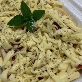2 Panquecas com muito Queijo mussarela, Cream Cheese Philadelphia Original, Bacon em cubo frito e milho. Por cima molho da sua Preferência, Queijo mussarela picada e orégano ( se quiser tirar algo, favor avisar na observação)