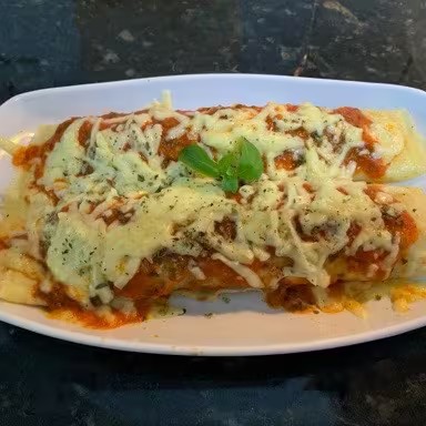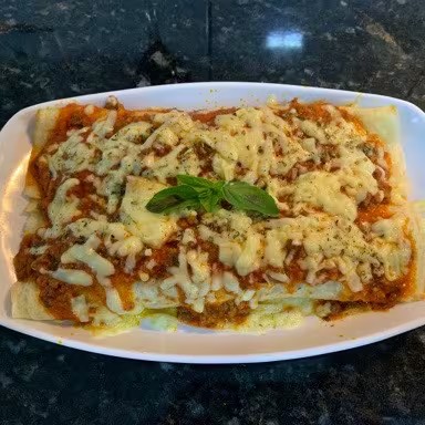 2 Panquecas bem recheadas! Brasileirinha é explosão de Sabor. Tempero italiano especial de Família. Por cima, Molho de Queijo ou tomate, mais queijo mussarela e orégano salpicado por cima.