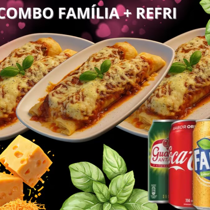3 Bandejas de Panquecas grandes da sua escolha, (total 6 panquecas) bem servidas para 3 pessoas + 3 Refri Lata de 350ml Refeição completa pra família toda!