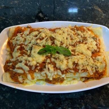 2 Panquecas grandes de Carne moída com Mussarela Ou Cheddar ou Catupiry . Escolha seu molho de Preferência entre (molho de queijo ou molho de tomate) em cima do molho tem muuuito queijo mussarela ralada e orégano. Serve muito bem uma pessoa.