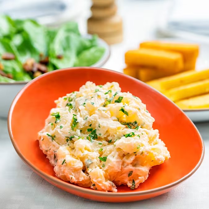Deliciosa salada de batatas cozidas ao ponto perfeito e temperada na medida certa.