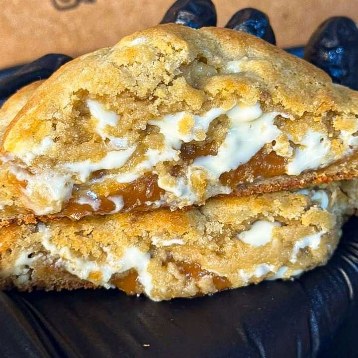 Esse cookie de doce de leite é uma maravilha! Massa tradicional com chocolate branco, recheio de muito doce de leite de qualidade. Ele é grandão. (aprox 150g). Todos os nossos cookies são com massa crocante por fora e macia por dentro, nada daquela massa que parece bolo batumado sabe?