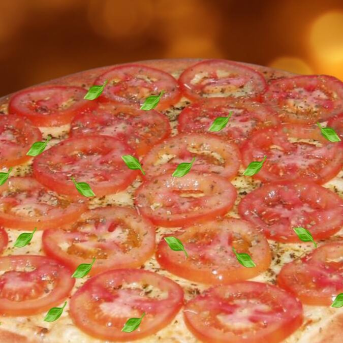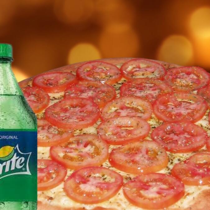 Pizza artesanal, base com molho de tomate e mussarela, com tomates frescos fatiados, aquele aroma delicioso de orégano e finalizado com manjericão fresco + Sprite 2l