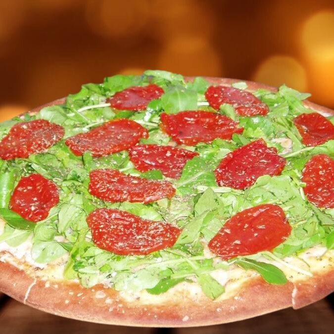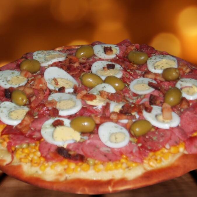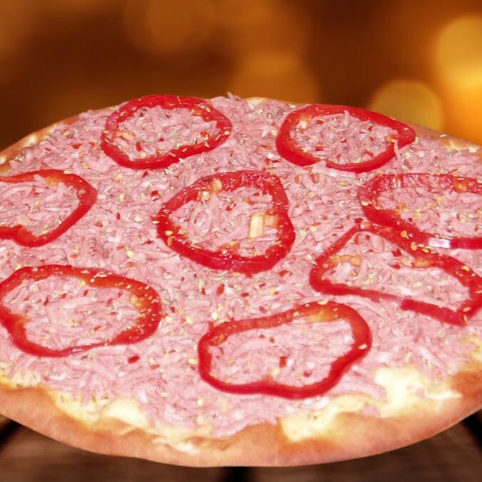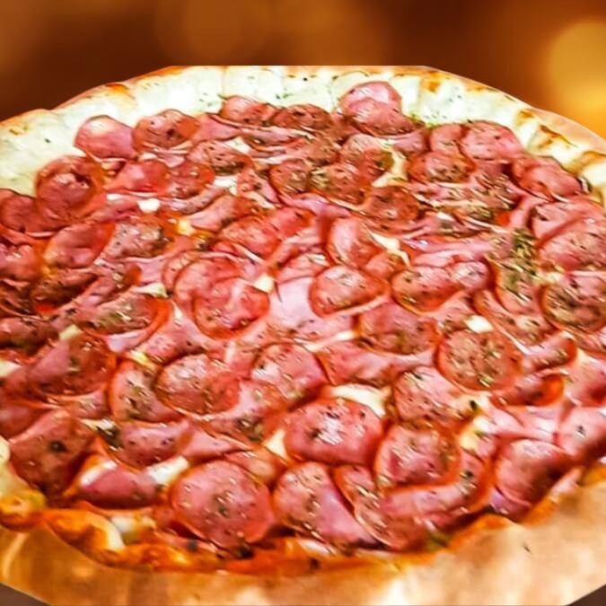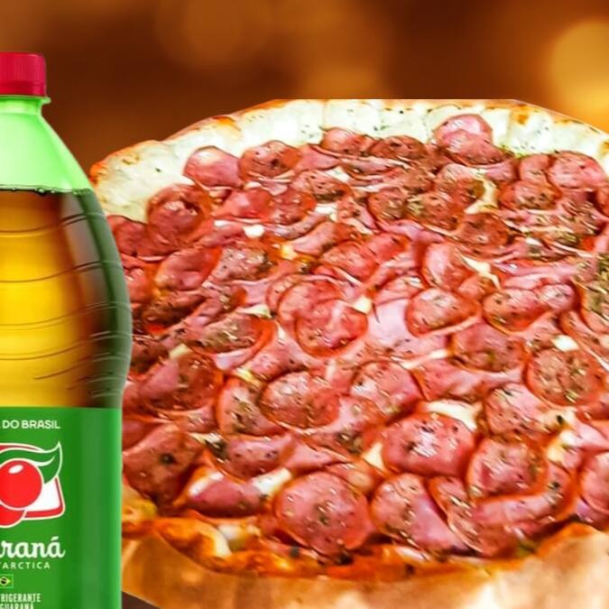 Pizza artesanal, base com molho de tomate e mussarela, calabresa em fatias finas e aquele aroma delicioso de orégano + Guaraná 2l