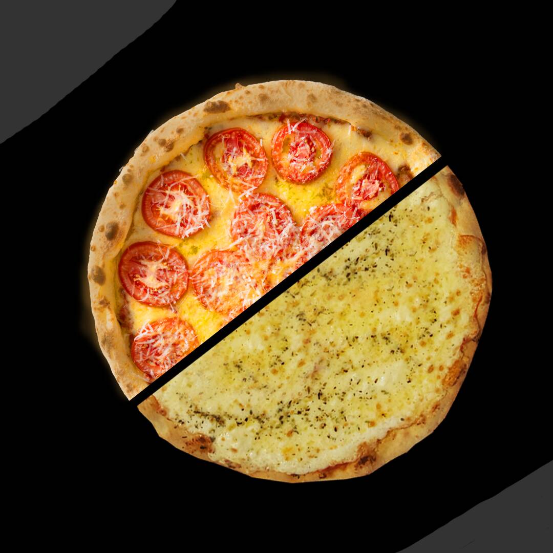 Pizza Média do seu jeito: escolha a massa, aproveite 6 fatias práticas e combine até 2 sabores
