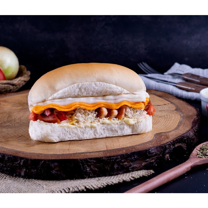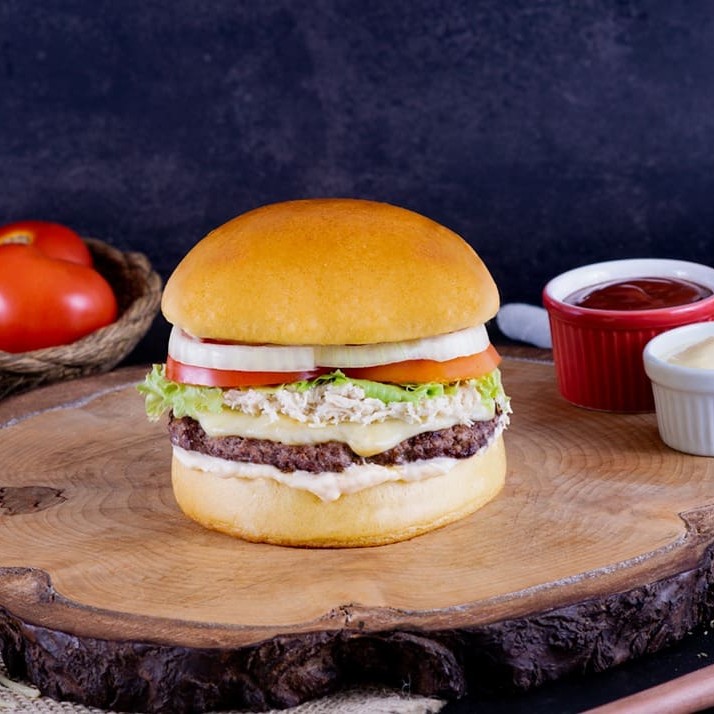 Pão, maionese Hellmann´s, hambúrguer de 120gr, frango desfiado, muçarela ou cheddar, tomate, cebola e alface americana.