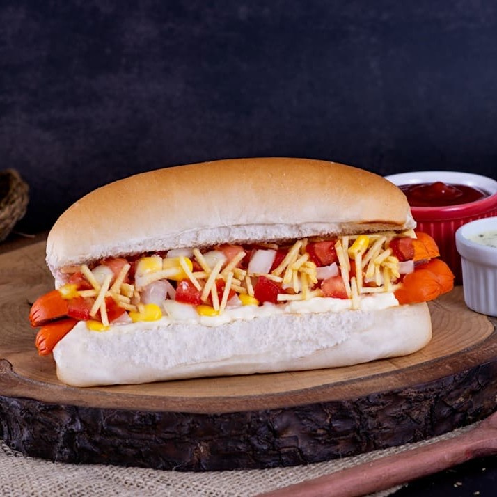 01 salsicha Perdigão, bacon, calabresa, frango, Catupiry, cheddar, maionese Hellmann´s, salada (tomate, milho e cebola) e batata palha.