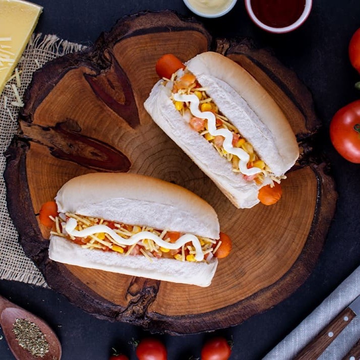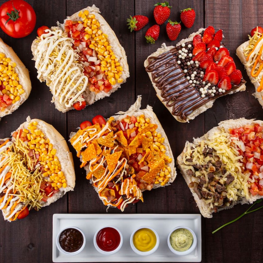 02 salsichas Perdigão, maionese Hellmann´s, parmesão, salada ( tomate, milho e cebola), e batata palha.