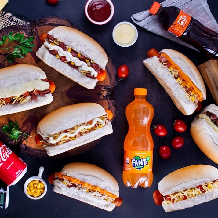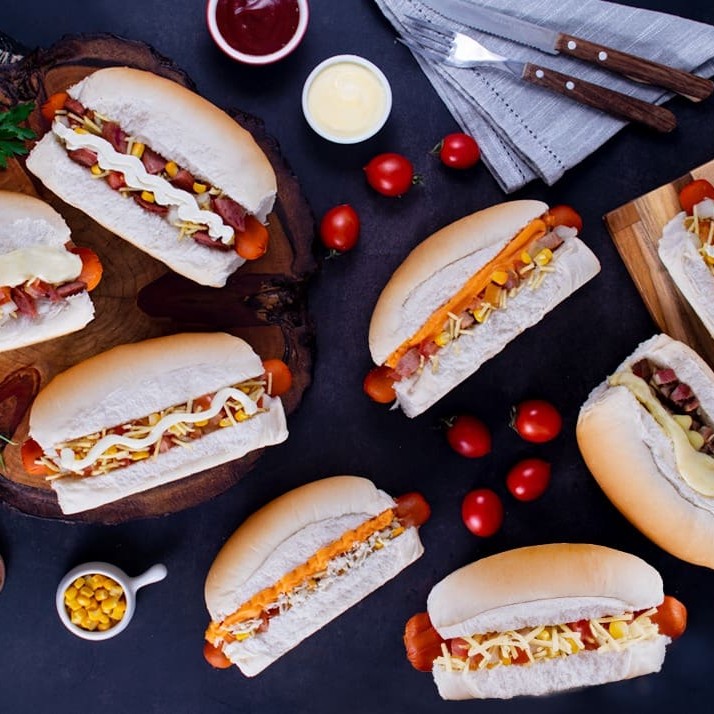 02 salsichas Perdigão, maionese Hellmann´s, salada (tomate, milho e cebola), e batata palha.