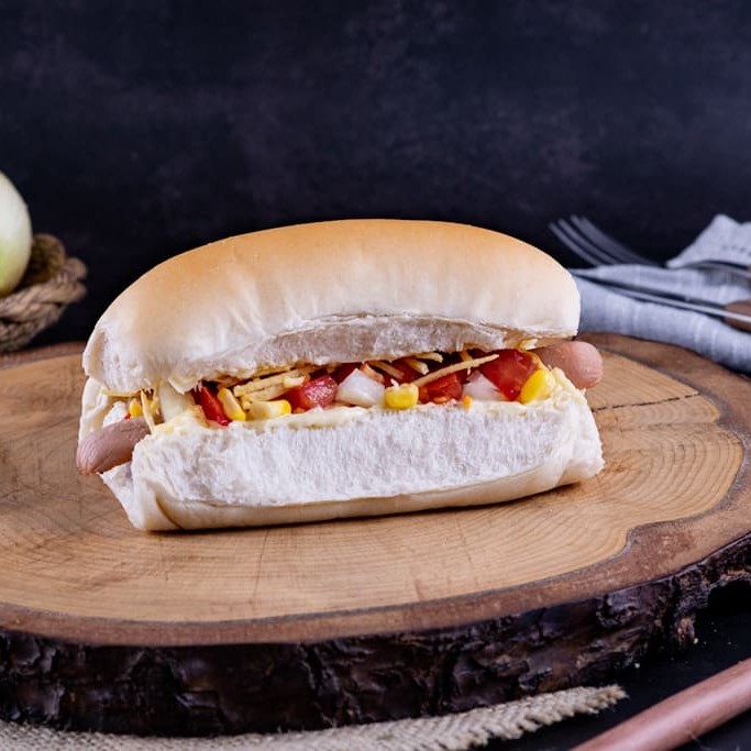 01 salsicha Perdigão, bacon ou calabresa ou frango, maionese Hellmann´s, salada ( tomate, milho e cebola), e batata palha.