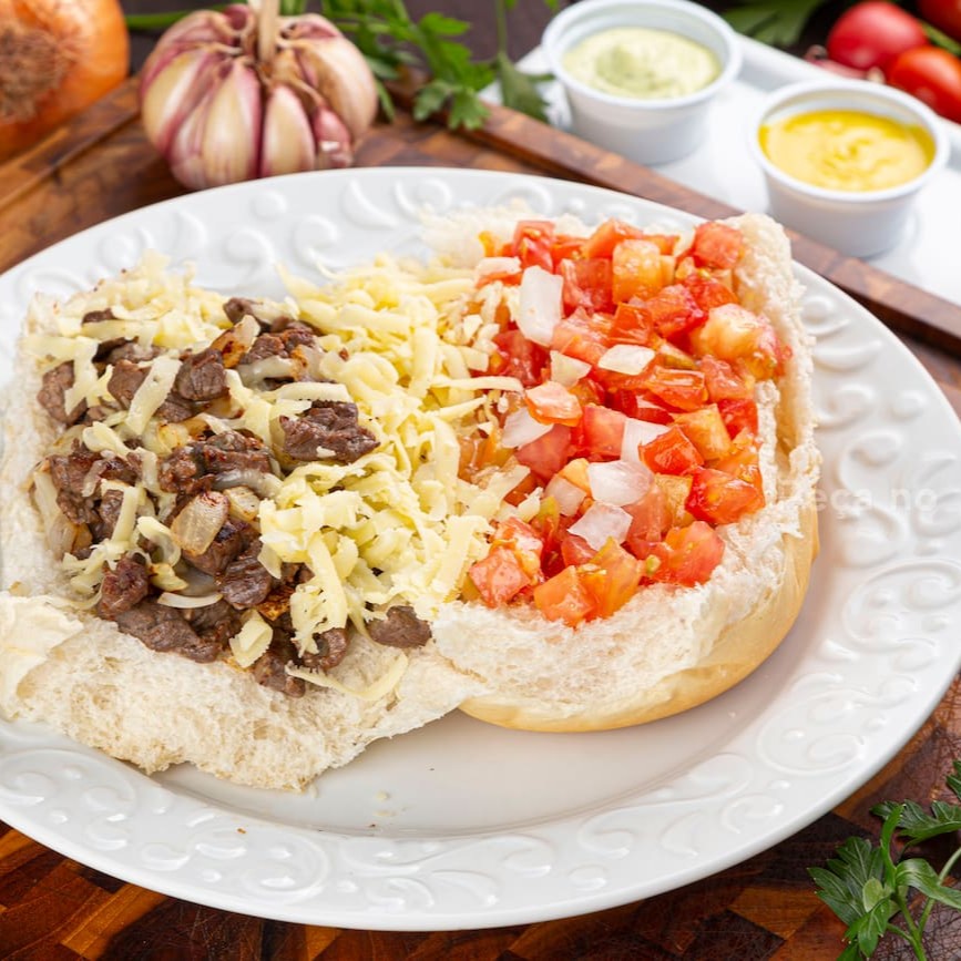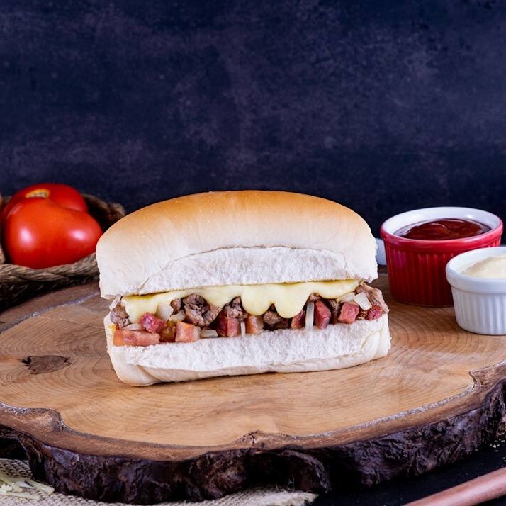 Alcatra em tiras, muçarela ou cheddar, maionese Hellmann´s, tomate e cebola frita.