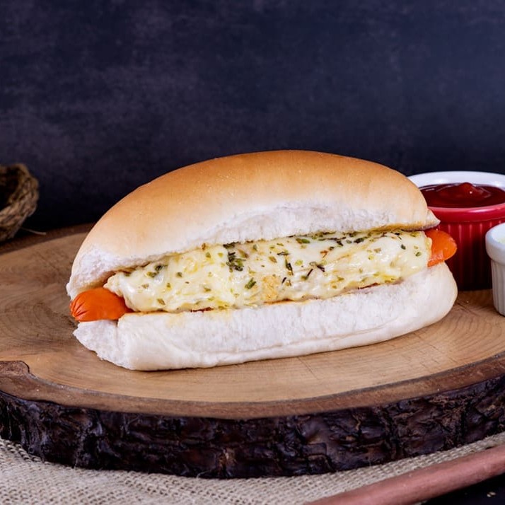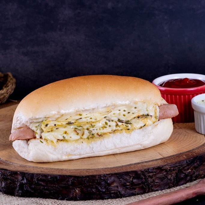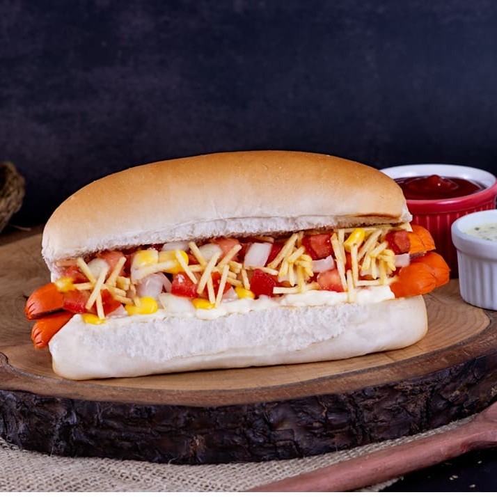 01 salsicha de soja, muçarela, cream cheese Philadelphia, cheddar, Catupiry, parmesão, maionese Hellmann´s, saladas (tomate, milho e cebola) e batata palha.