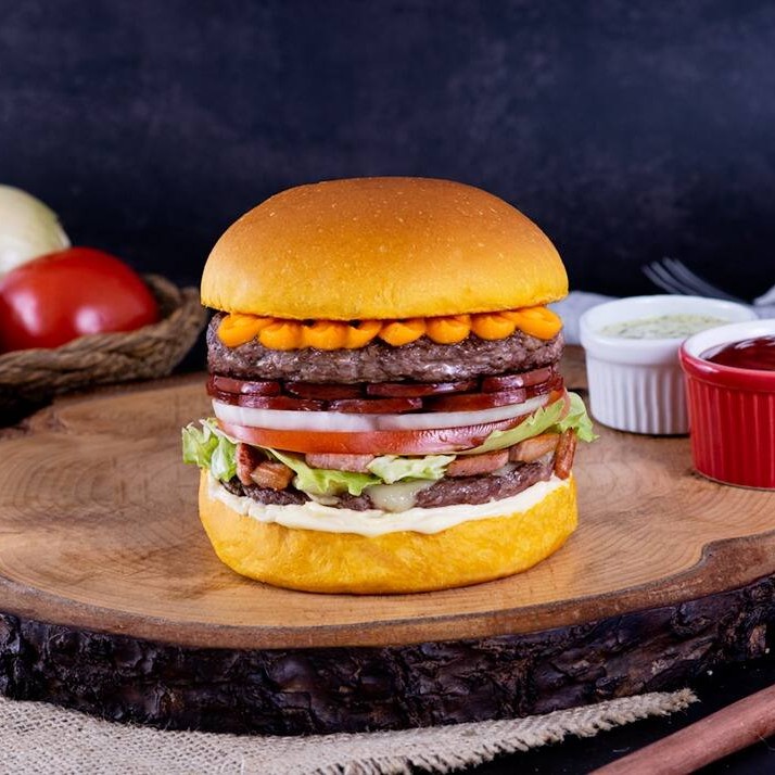 Pão, maionese Hellmann´s, 2 hambúrguer de 120gr, bacon, calabresa, muçarela, cheddar, tomate, cebola e alface americana.