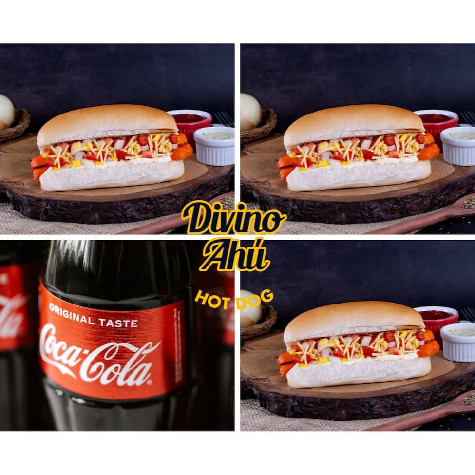 3 Hot Dogs Divino Dog: Pão, 1 salsicha Perdigão, maionese Hellmann´s, calabresa, bacon, frango, Catupiry e cheddar tomate, milho, cebola e batata palha. 1 Refrigerante 600ml.