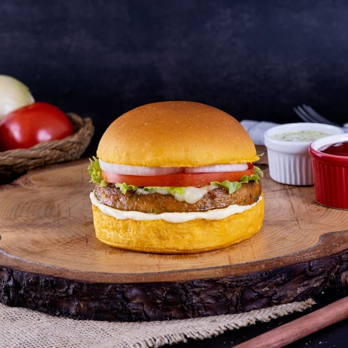 Pão, maionese Hellmann´s, hambúrguer vegetariano, queijos, muçarela ou cheddar, tomate, cebola e alface americana.