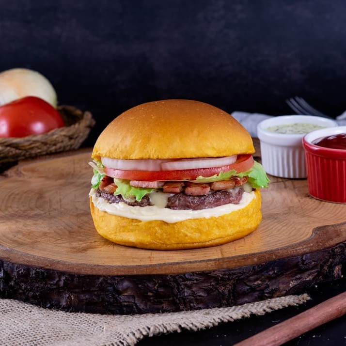 Pão, maionese Hellmann´s, hambúrguer de 120gr, bacon, muçarela ou cheddar, tomate, cebola e alface americana.