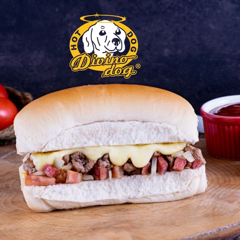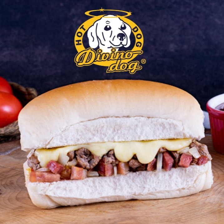 Pão, 1 salsicha (Perdigão), bacon, calabresa, frango, Catupiry, cheddar, mussarela, orégano, maionese, tomate, cebola, Milho e Batata Palha.