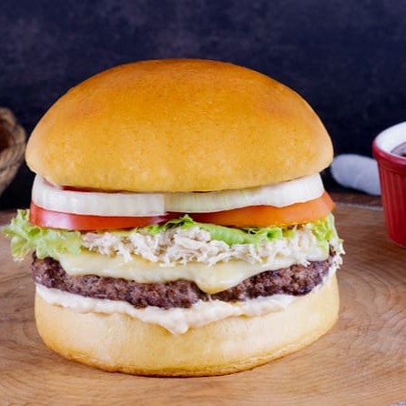 Pão, maionese, hambúrguer 120gr, frango desfiado, mussarela ou cheddar, tomate, cebola e alface americana.