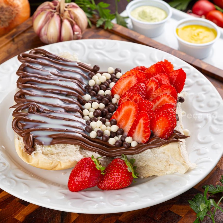 Pão, morango, leite Ninho, chocolate branco, leite condensando e chocoball.