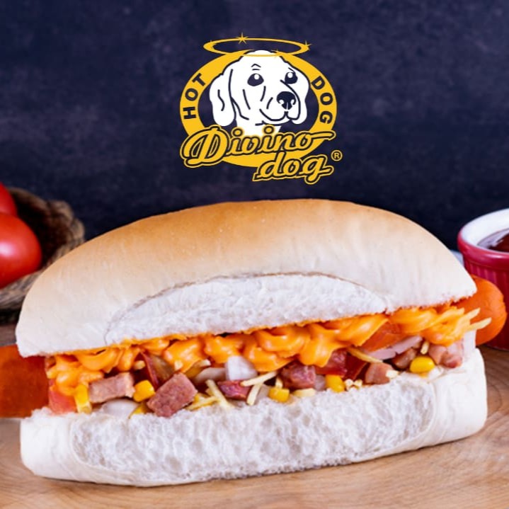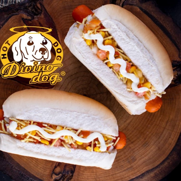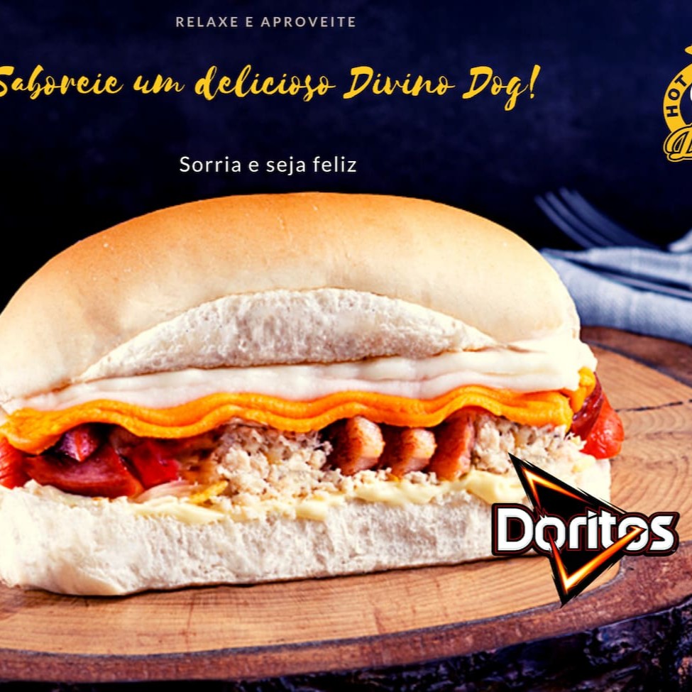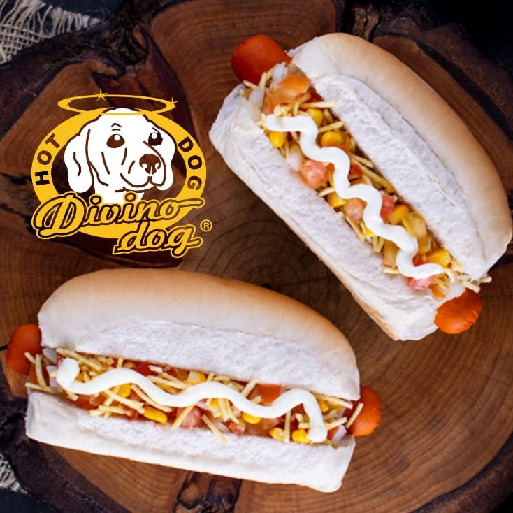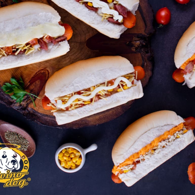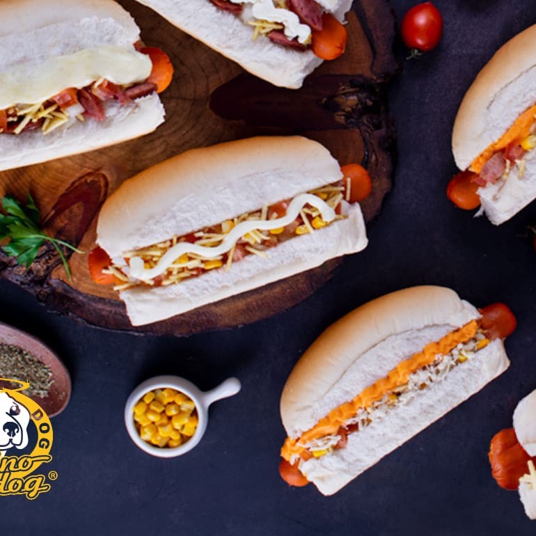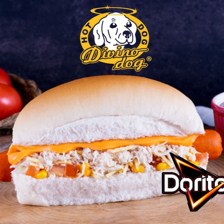 Pão, 1 salsicha (Perdigão), frango ou bacon ou calabresa, cheddar, maionese, tomate, cebola, Milho e Doritos.