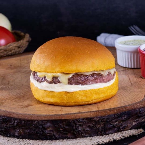 Pão, maionese, hambúrguer 120gr, queijo mussarela ou cheddar.