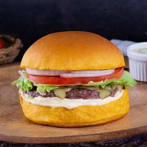 Pão, maionese, hambúrguer 120gr, mussarela ou cheddar, tomate, cebola e alface americana.