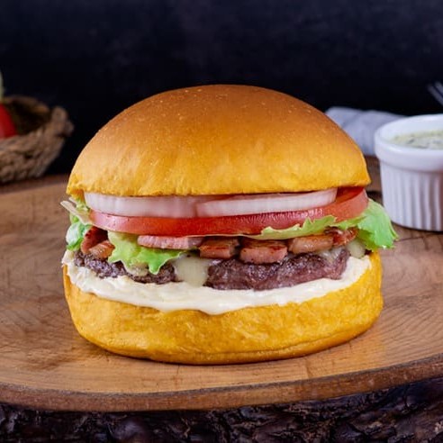 Pão, maionese, hambúrguer 120gr, bacon, mussarela ou cheddar, tomate, cebola e alface americana.