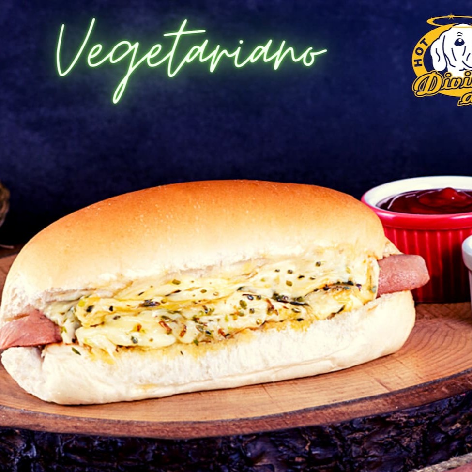 Pão, 1 salsicha de soja, mussarela, cream cheese, cheddar, Catupiry, parmesão fresco, maionese, tomate, cebola, Milho e Batata Palha.