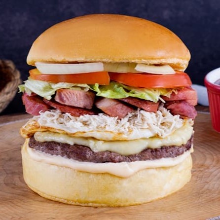 Pão, maionese, 2 hambúrguer 120gr, bacon, calabresa, mussarela, cheddar, tomate, cebola e alface americana.