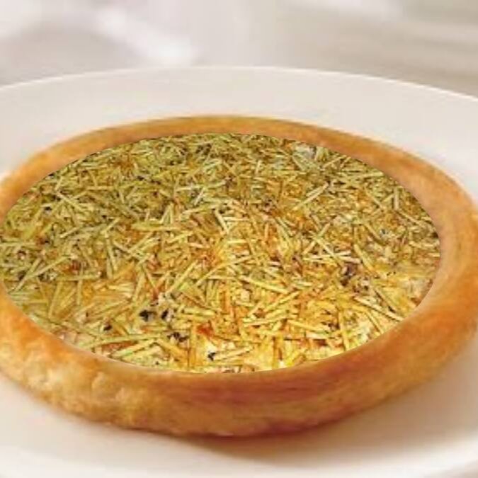 Mussarela, strogonoff de frango (frango desfiado), batata palha, orégano