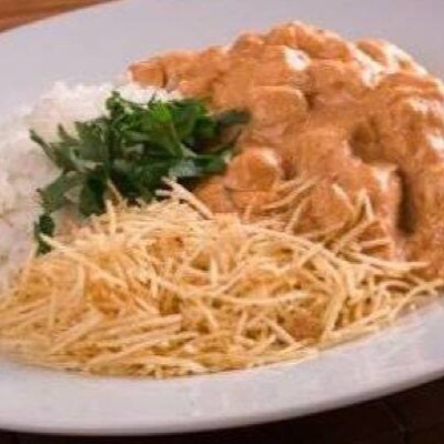 Estrogonofe de frango, arroz, e batata palha separada, serve 2 pessoas.