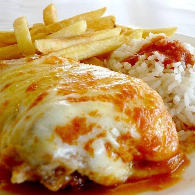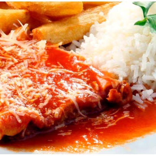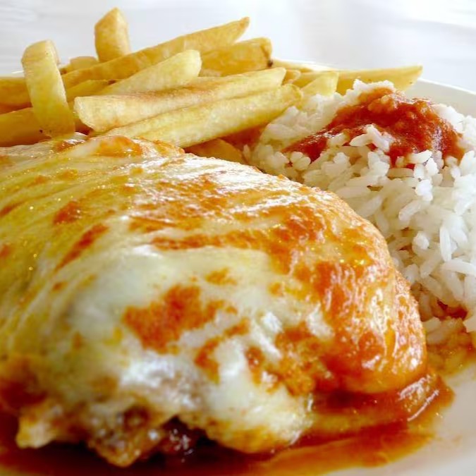 Nosso 'Mignon à Parmegiana' é um prato primorosamente preparado, apresentando um corte suculento de filé mignon regado com um molho sugo autêntico e ricamente gratinado com queijo de primeira qualidade. Acompanhado por um arroz delicadamente temperado e batatas fritas crocantes, oferece uma experiência gastronômica singular. Este prato é servido em porção individual, perfeitamente preparado para consumo imediato. Lembramos que não são permitidas alterações e mudanças nos sabores dos itens descritos. A imagem é meramente ilustrativa. Saboreie essa delícia sem modificações e desfrute do sabor autêntico da nossa cozinha!