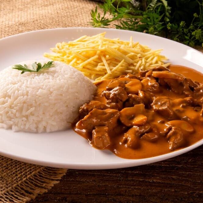 Apresentamos nosso Estrogonofe de Filé Mignon, uma das estrelas da categoria 'Os Melhores do Pilar'. Este prato é composto por tiras tenras e suculentas de mignon, envolvidas em um molho de estrogonofe luxuosamente cremoso e saboroso. Acompanha um arroz branco perfeitamente cozido e uma generosa porção de batata palha crocante. Este prato é individual e ideal para um almoço ou jantar sofisticado. Atenção: a imagem é meramente ilustrativa e alterações no pedido não são permitidas. O prato é preparado para consumo imediato e não oferecemos opções de mudanças nos sabores dos itens descritos.