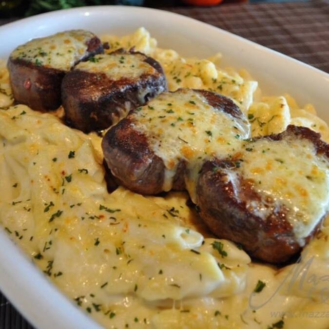 Desfrute de uma experiência culinária requintada com nosso 'Mignon ao Molho Quatro Queijos'. Apresenta um generoso filé mignon de 300g, cuidadosamente grelhado até a perfeição, regado com um rico e cremoso molho de quatro queijos. Acompanha uma porção de massa talharim, delicadamente cozida 'al dente'. Este prato é perfeito para duas pessoas, tornando-o uma opção ideal para um jantar aconchegante. Por favor, note que as fotos são meramente ilustrativas e que alterações nos sabores dos itens descritos não serão realizadas.