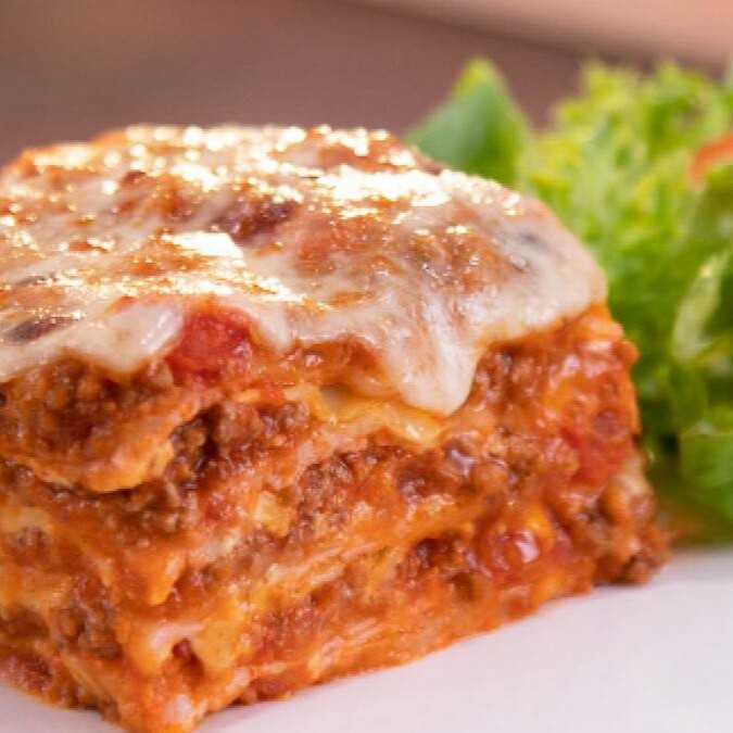 Deliciosa lasanha ao molho a bolonhesa, com molho da casa de tomate, presunto, molho branco e muçarela.
