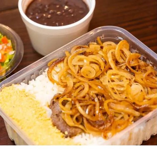 Nosso 'Bife Acebolado Executivo' é uma verdadeira experiência culinária clássica e sofisticada. Consiste em um suculento bife bovino, cuidadosamente preparado e coberto com finas fatias de cebola, acompanhado de um arroz soltinho e de um feijão caseiro, que remetem ao sabor familiar da comida brasileira. A farofa crocante e a salada fresca do Dia proporcionam o equilíbrio perfeito para esta refeição. Este produto é destinado para consumo imediato e é servido em uma porção individual, com peso aproximado que inclui todos os componentes, não apenas a proteína. Favor notar que alterações e mudanças nos sabores descritos não são permitidas. A imagem é meramente ilustrativa. Desfrute desta deliciosa opção de nosso cardápio de 'Pratos Executivos Tradicionais'.