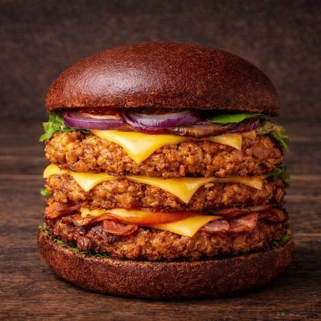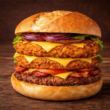 Um hambúrguer vegetariano de 150g feito com grão-de-bico. Uma opção saudável e cheia de sabor! Venha conhecer nosso hambúrguer do futuro. (Imagem ilustrativa)