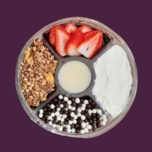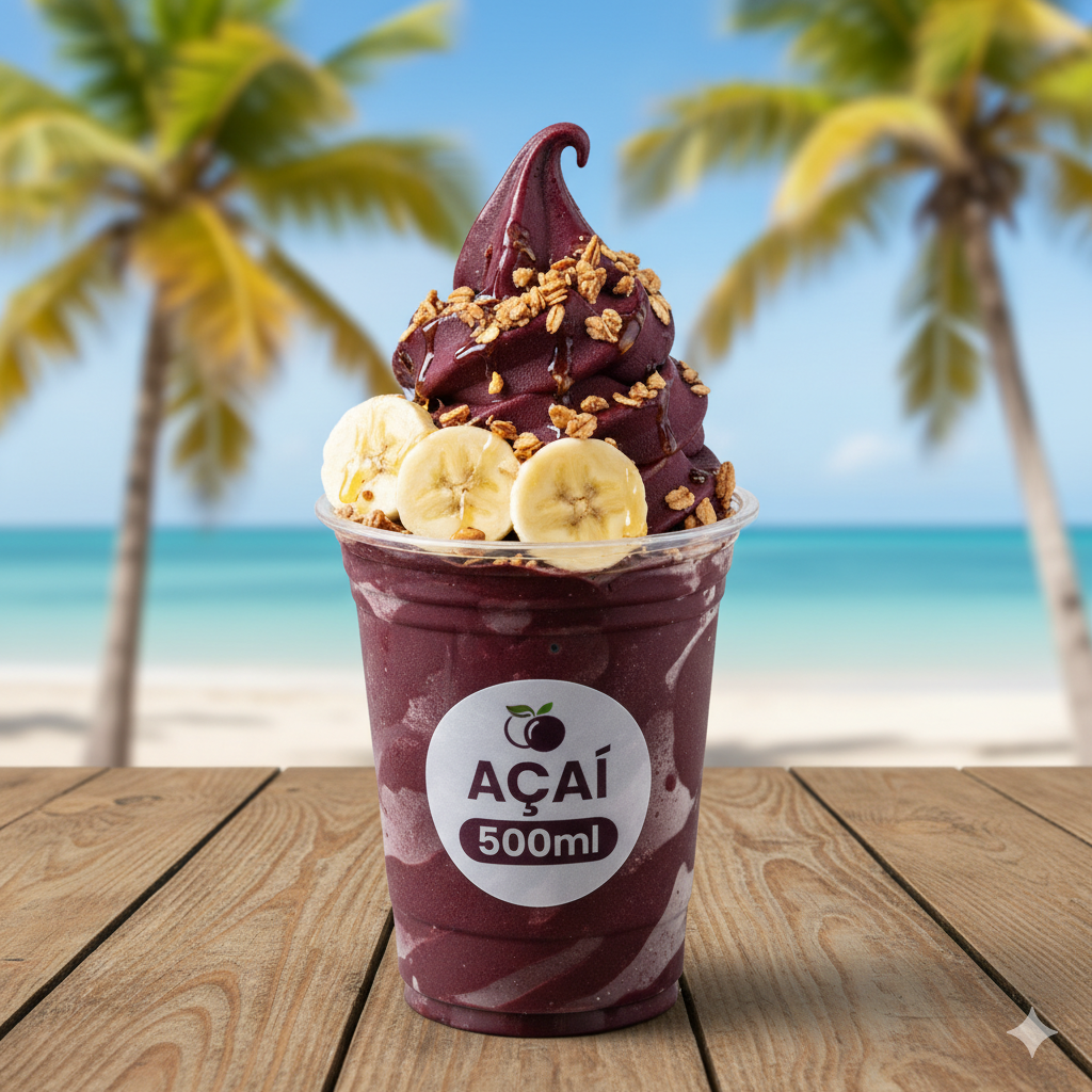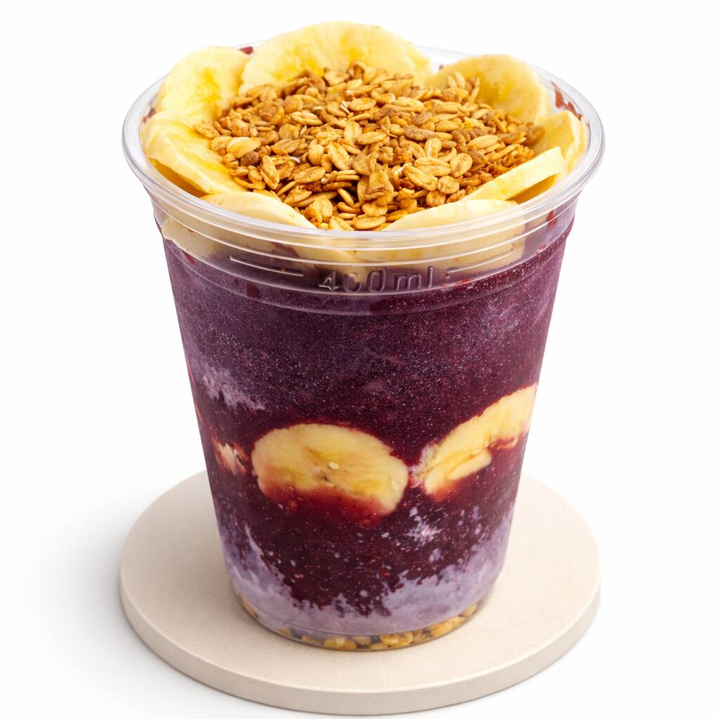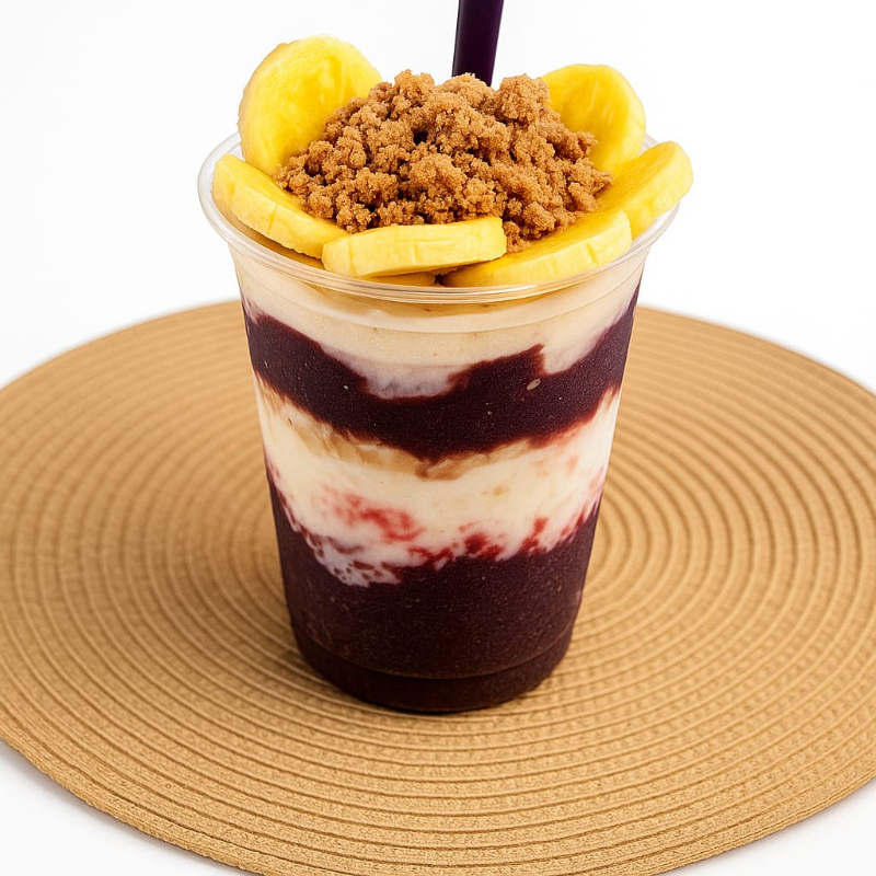 Açaí cremoso e bem gelado com banana, leite em pó e granola crocante. Uma combinação clássica, equilibrada e deliciosa, perfeita para qualquer hora.